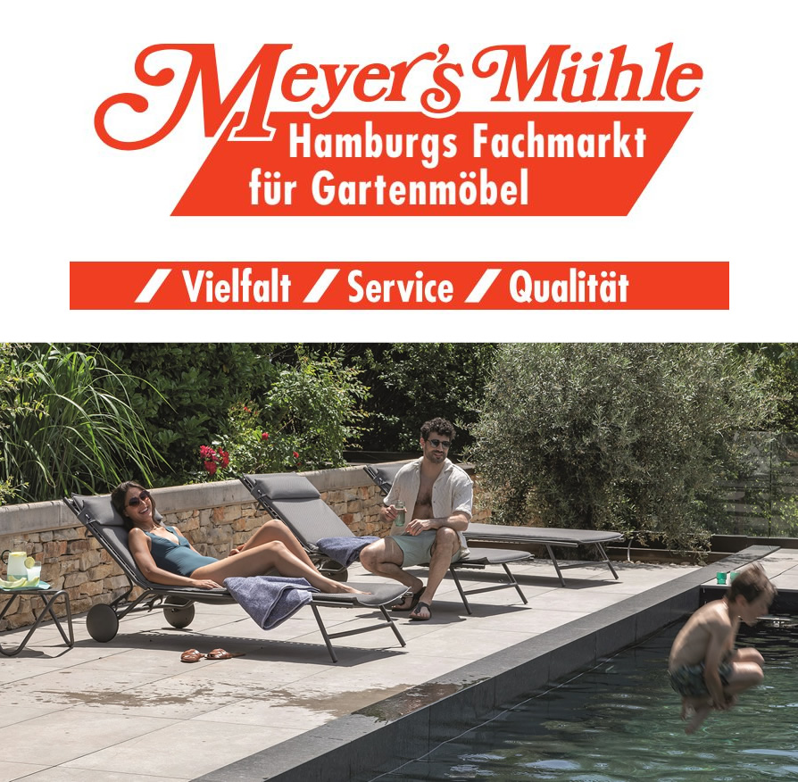 Wir sind Norddeutschlands großer Spezialist für Gartenmöbel. Mit einer über einhundertjährigen Firmentradition Meyer`s Mühle und der Erfahrung von über vier Jahrzehnten bei Gartenmöbeln sind wir mit einer riesigen Ausstellung in Norderstedt am nördlichen Stadtrand von Hamburg präsent. Unsere langjährige Erfahrung kommt Ihnen besonders in den Bereichen Sortiment, Service und Beratung zugute.