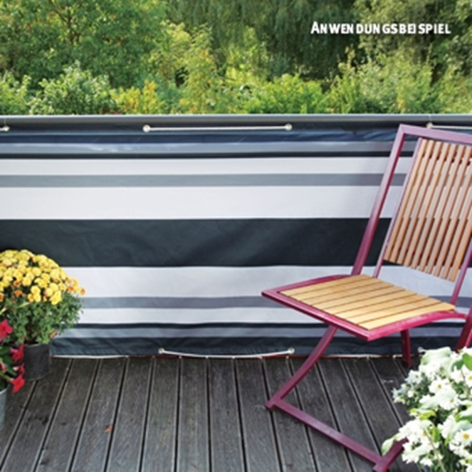Bestehend aus 12 mm breiten ovalen PVC-Röhrchen, die durch Fadenbindung flexibel dicht miteinander verbunden sind. Erhältlich in Rollen von 3 Meter Länge und 90 cm Höhe zur direkten Anbringung am Balkongeländer mittels PVC-Schlaufen. Wird mehr als 3m Länge benötigt, so lassen sich zwei Rollen leicht durch gleichfarbige Clips verbinden. Soll dagegen die Länge gekürzt werden, so kann die Fadenbindung an jeder beliebigen Stelle zwischen den Röhrchen mit einem Messer durchtrennt werden. SUNLINE in satiniert-transparenter Ausführung für ca. 49 € je Rolle. Alternativ RÜGEN in grauen und bräunlichen Farbtönen für ca. 39 € je Rolle. Die passenden Befestigungsschlaufen ca. 4 € je Beutel 25 Stück.