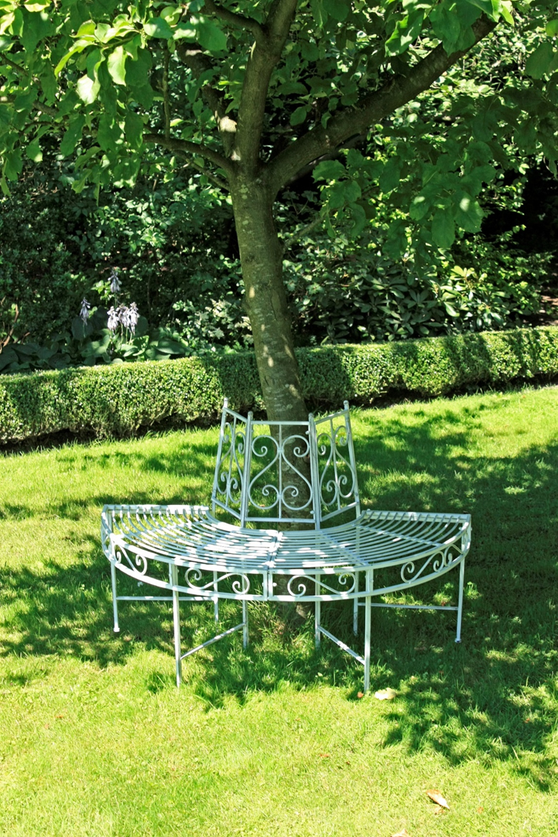 Lässt jeden Baumstamm im Garten noch schöner wirken. Ganz aus Eisendekor schwarz beschichtet, als Halbkreis 150 cm und 78 cm hoch für ca. 249 €. Mit zwei Halbkreisen kann der Baum auch ganz umrundet werden.