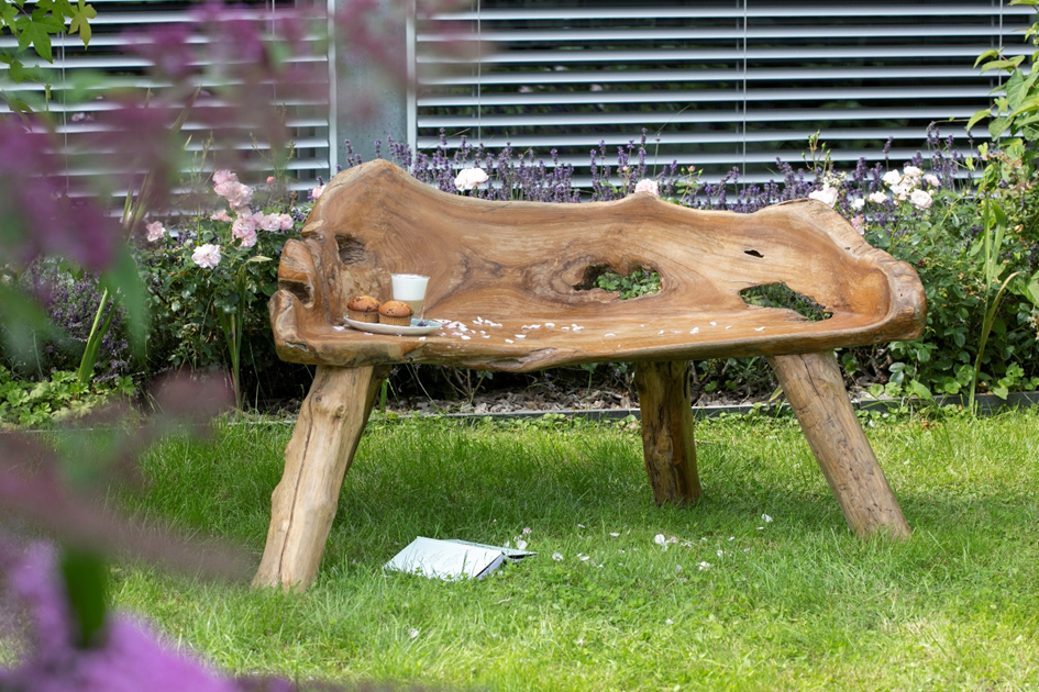 Ein ausgehöhlter Teak-Baumstamm auf knorrigen Stützbeinen ist die Urform aller Sitzbänke. Originell zur Gartendekoration, vor Blockhaus oder Jagdhütte und natürlich als Sitzplatz in der urigen Kellerbar. Jedes Stück ein Unikat in der Länge von ca. 120-130 cm für ca. 395 €.