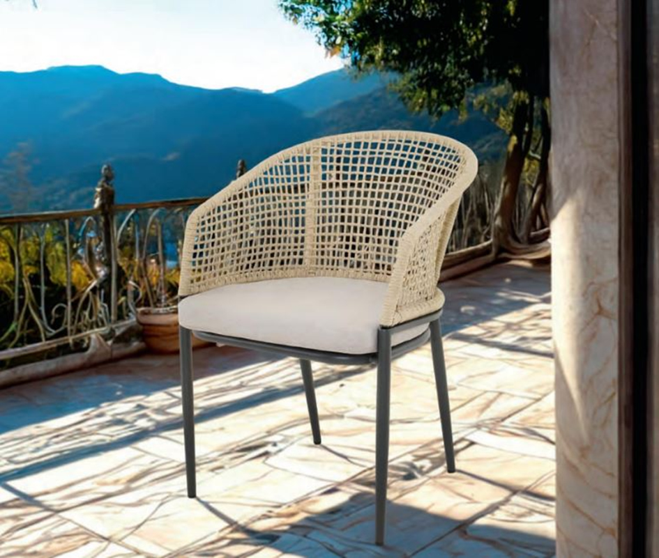Bequemer Gartenstuhl aus Alu-Rundrohr anthrazit mit Rope Rückenbespannung und Sitzkissen beige für ca. 129 €.