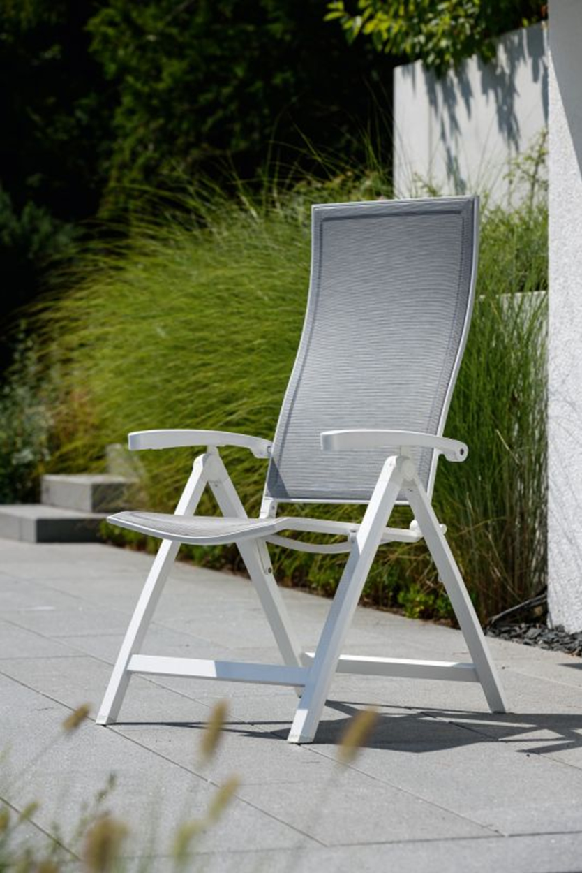 Das Erfolgsmodell mit perfekter Sitz- und Rückenformung. Solides Alugestell in weiß oder graphit beschichtet mit schöner Textilen-Bespannung und verstellbaren Armlehnen für ca. 329 €.