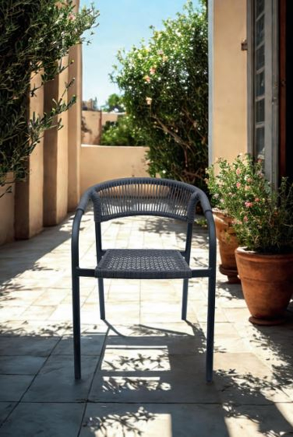 Gut geformter Stapelstuhl aus Alu-Rundrohr mit Rope-Bespannung anthrazit für ca. 89 €.