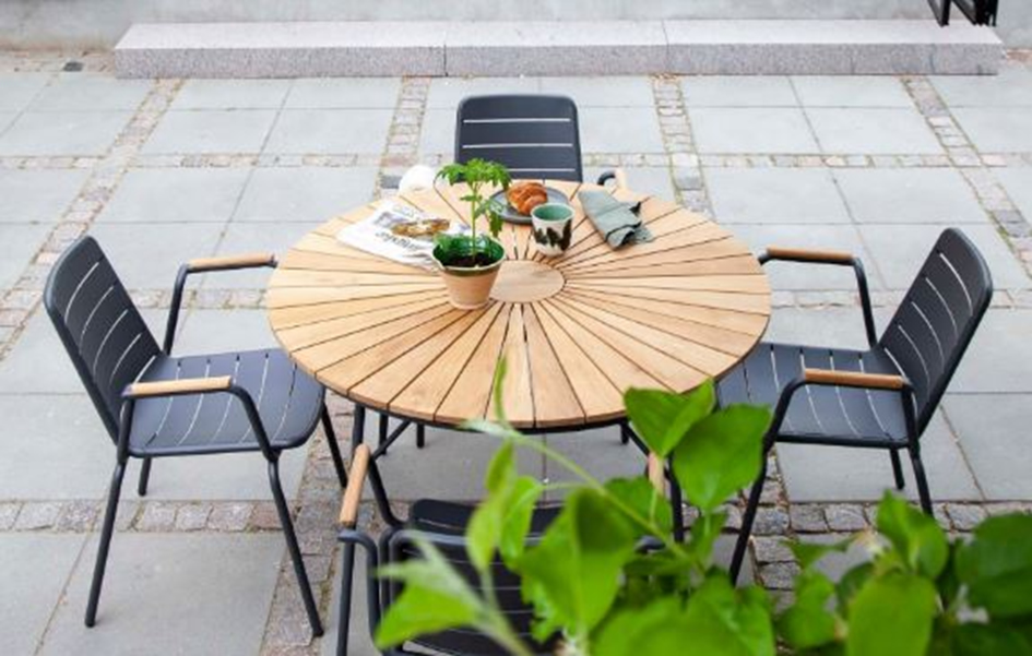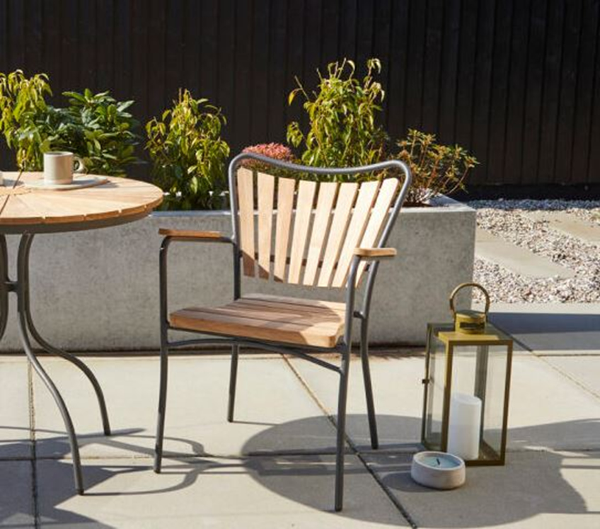Aus anthrazit oder weiß beschichtetem Alurohr mit schwungvoll geformter Rückenpartie. Sitzfläche, Rücken und Armlehnen mit natürlicher Teakholz-Belattung. Sessel ca. 179 € und Tisch Ø 80 cm ca. 375 €.