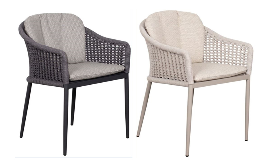 Schön geformte Sitzschalen aus Alu mit Rope-Flechtung im Farbton anthrazit oder vanille. Komplett mit Sitz- und Rückenkissen je ca. 249 €.