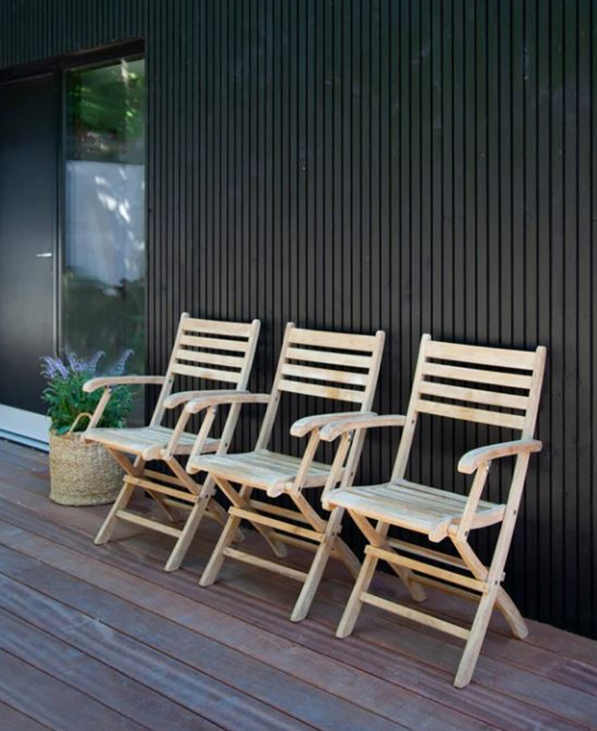 Diese Basic-Teakmöbel in der klassischen Kreuzbein-Form sind mit einfachem Handgriff zusammenklappbar. Tisch Ø 90 cm ca. 199 € und Klappstuhl ca. 49 €.