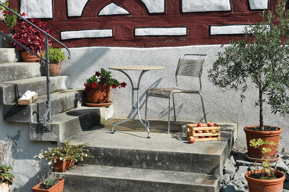 Traditionelle Gartenmöbel aus der Schweiz. Solide Stahlrohrgestelle in feuerverzinkter Qualität. Der Spaghettistuhl SÄNTIS mit hochwertiger PVC-Bespannung für ca. 195 € in Farbe rot passend zur gleichfarbigen Tischplatte Ø 60 oder 80 cm ab ca. 349 €.
