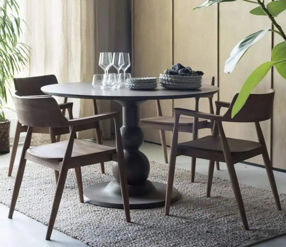 Mango und Teak Holzmöbel mit dem Charme klassischer Formen und natürlichen Materials. Tisch Ø 120 cm ca. 795 €. Sessel ca. 295 €.