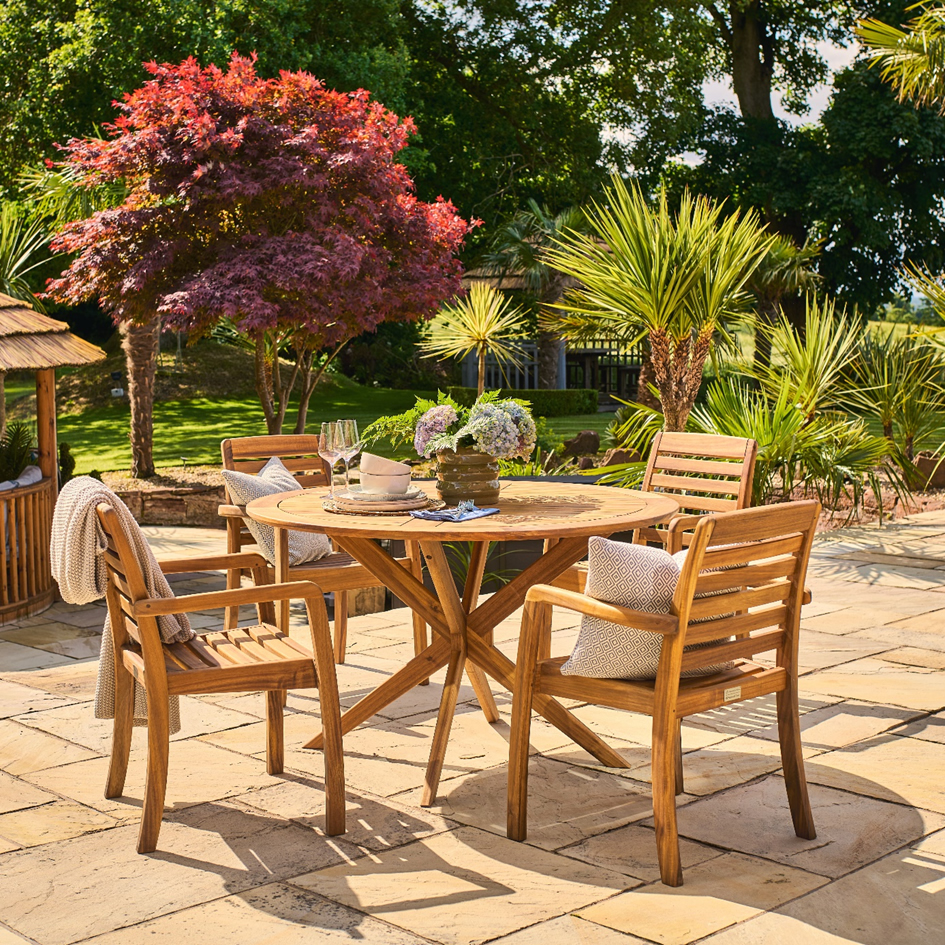 Schön geformte Gartenmöbel aus Akazienholz mit natürlich geölten Oberflächen. Der Sessel für ca. 225 € und Tisch Ø 125 cm ca. 445 €.