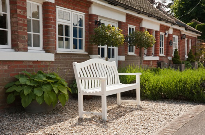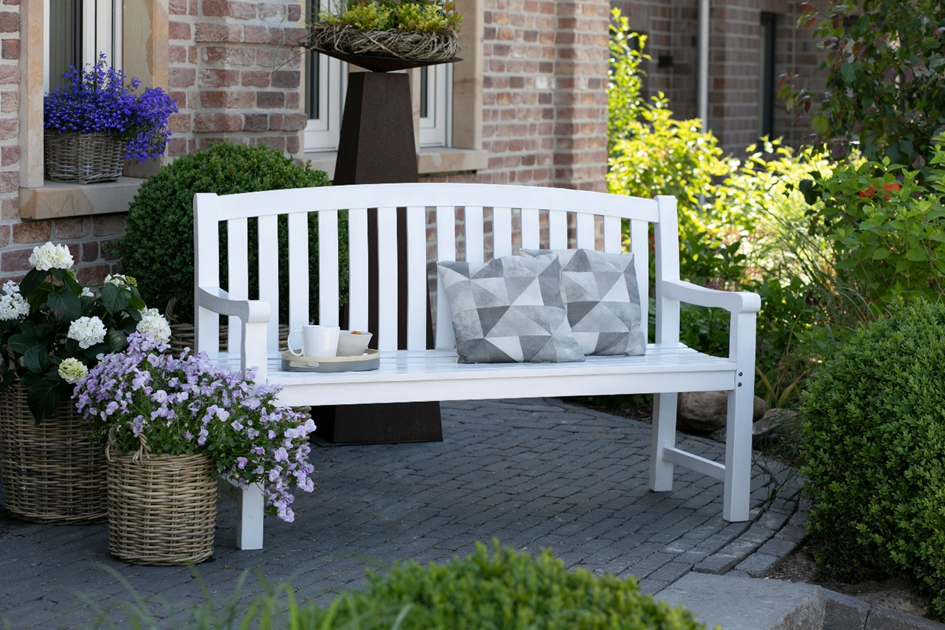 Ein Blickfang für jeden Garten: Die besonders schön geformte Bank TURNBERRY aus Akazienholz mit Rückenbogen und sehr breiten Armlehnen bietet besten Sitzkomfort für 3 Personen. Bank 152 cm in weiß beschichtet ca. 399 €. Alternativ auch in vintage-grau für ca. 475 €.