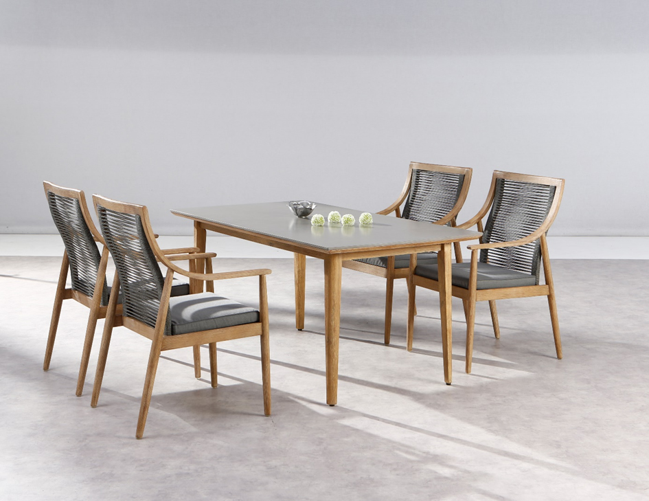 Skandinavisch anmutendes Holz-Design mit quer gespannter Rope-Kordel verleiht dieser Gruppe besonderen Sitzkomfort und natürlichen Charme. Die Sessel aus gebürsteten Eukalyptusholz mit dem reißfesten Rope-Geflecht und waschbaren Sitzkissen für ca. 245 €. Hierzu perfekt kombiniert der Holztisch 170x90 cm mit aufgelegter Faserzementplatte hellgrau poliert für ca. 495 €.
