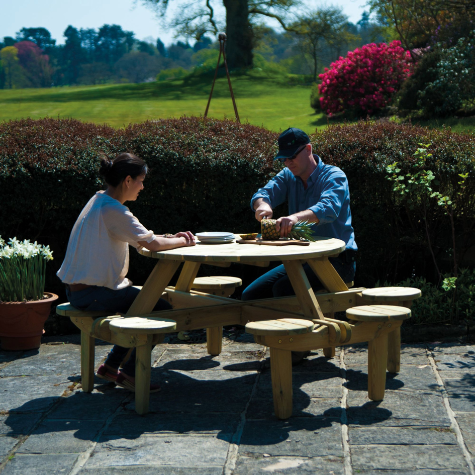Eine originelle Sitzgarnitur für Bier- und Brotzeit mit maximal 8 Personen. Die Tischplatte ca. 112 cm Durchmesser in Konstruktionseinheit mit 4 x 2 = 8 runden Sitzplätzen. Gesamt ca. 190 cm Durchmesser, mit 5 cm Schirmloch in der Mitte. Alles aus 3 cm starkem nordischem Kiefernholz wetterfest druckimprägniert. Komplett für ca. 675 €.