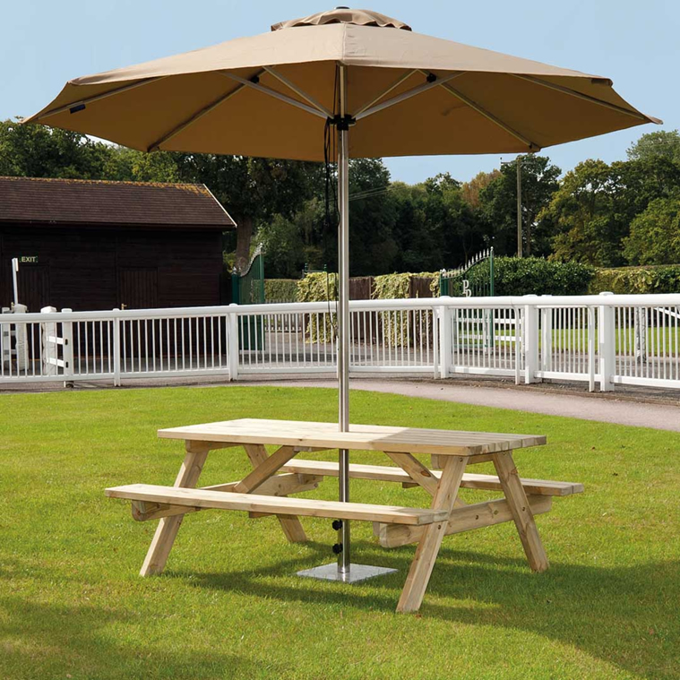 Ideal für viele Aktivitäten im Freien: Picknick, Grillparty, Kindergeburtstag, am Sportplatz usw. Ganz aus massivem Kiefernholz natur druckimprägniert, dadurch pflegefrei und wetterbeständig. Abmessung ca. 180 x 130 cm. Mit 5 cm Schirmloch in der Tischmitte für ca. 375 €. Perfekt dazu passend der Sonnenschirm Ø 300 cm Polyester natur mit Flaschenzug und 48 mm Edelstahl-Gestell für ca. 249 €.
