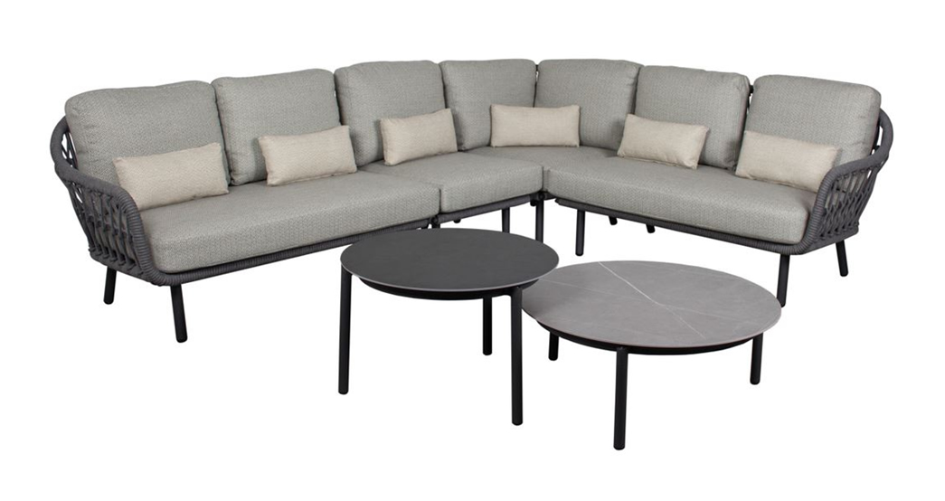 Alugestell mit offener Rope-Bespannung und hellgrauen Sitz-, Rücken- und Lendenkissen. Aufstellmaß 210 x 270 cm (links oder rechts). Komplett mit 2 Beistelltischen Ø 80 x 31 cm, Ø 66 x 43 cm für ca. 1990 €.