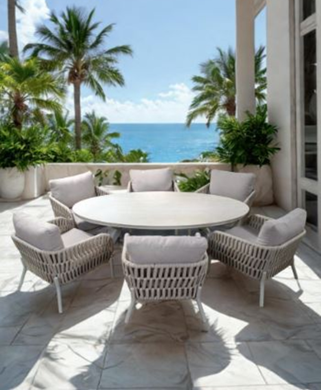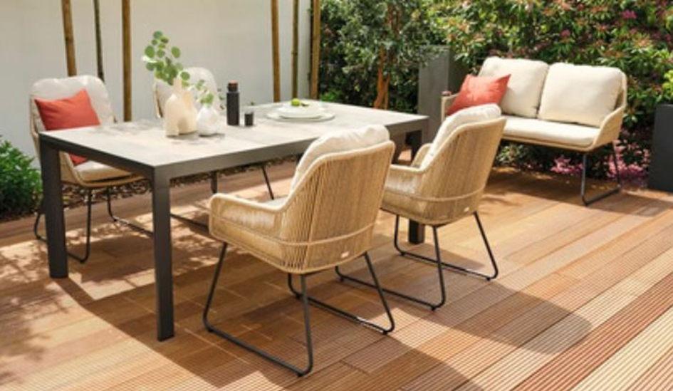 Gartenmöbel aus Alu in natürlicher Holz-Optik kombiniert mit markanter Rope-Wicklung und hellen Sitzpolstern. Sessel ca. 99 €, Tisch mit ovaler Mineralplatte 180 x 100 cm in warmer Marmor-Optik für ca. 695 €.