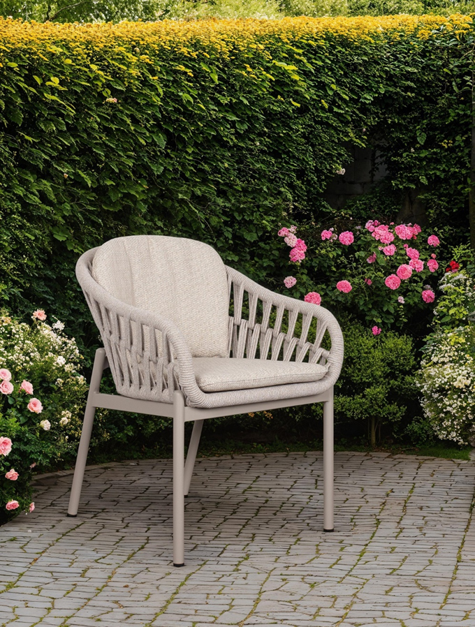 Alu Diningsessel mit Rope-Bespannung und Kissenset im Farbton sand für ca. 199 €.