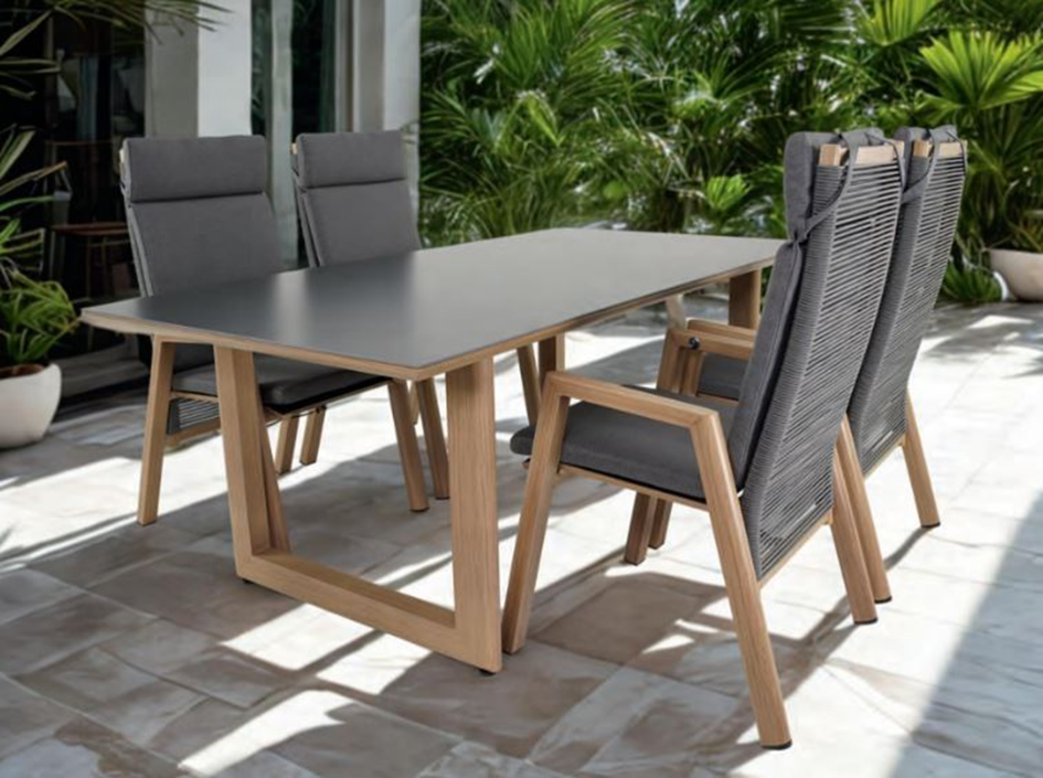 Alusessel im Holzdekor mit Rope-Bespannung und stufenlos verstellbarer Rückenlehne. Komplett mit grauer Auflage für ca. 333 €. Der passende Tisch mit Sinterstone-Platte 200 x 90 cm ca. 699 €.