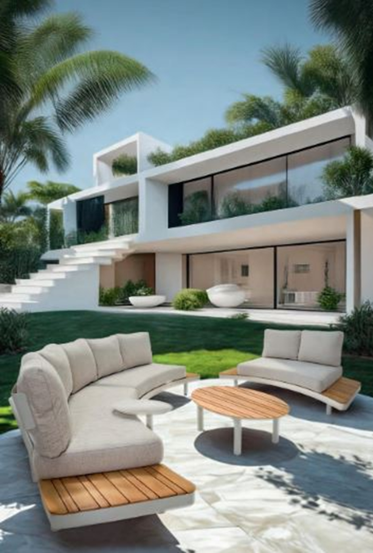 2 Sofa- und 1 Eckelement im Aufstellmaß 295 x 295 cm für ca. 2295 €. Zusätzlicher Sessel ca. 495 €. Gestelle aus Alu in Holzdekor mit Flechtband taupe und 15 cm dicken Polstern Acryl.