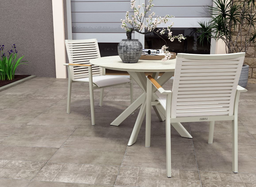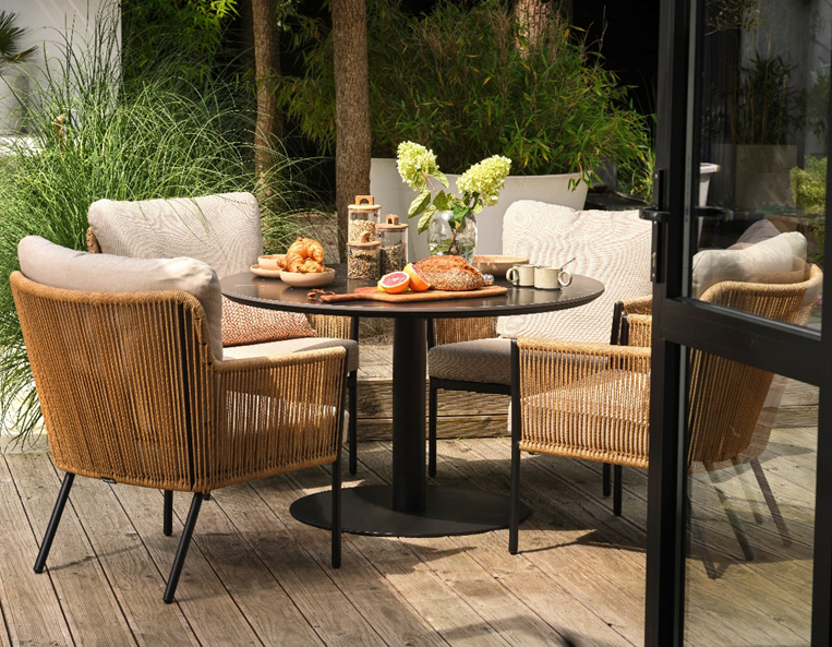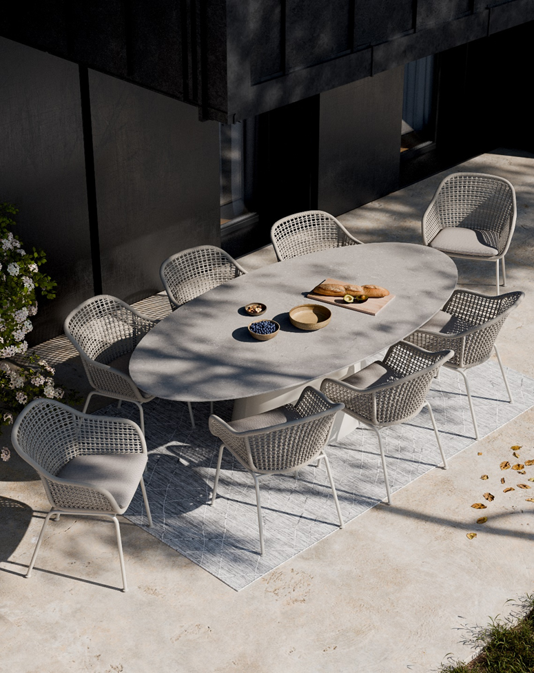Alu Stapelsessel im Farbton hell oder anthrazit mit Rückenbespannung aus Rope-Flachband für ca. 259 €. Der passende Tisch mit Alu-Gestell und Keramikplatte Ø 120 cm für ca. 995 €.