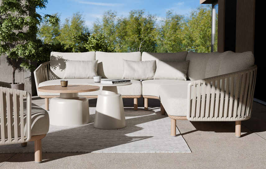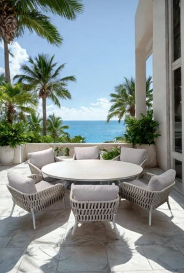 Loungesessel mit Rope-Geflecht und üppigen Polstern ca. 399 €. Ovaler Tisch 220 x 120 x 69 cm mit SinterStone Platte ca. 695 €. Trendfarbe hell beige.