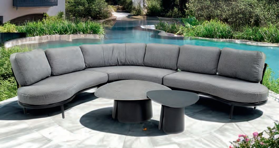 Loungesofa als rundlich geformter offener Halbkreis, bestehend aus 3 Grundelementen mit 15 cm dicker Polsterung für ca. 1950 €. Der passende Tisch mit 97 cm Sinterstone-Platte ca. 359 €. Zur Ergänzung noch einzelne Sessel je ca. 395 €.