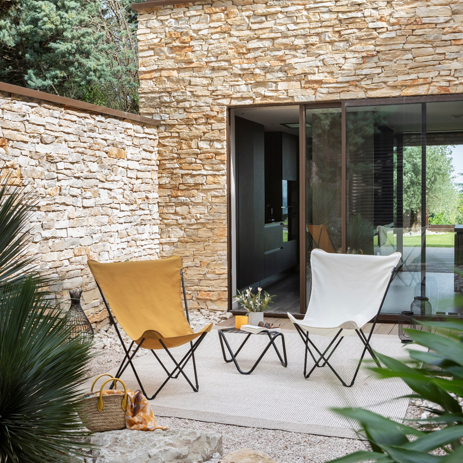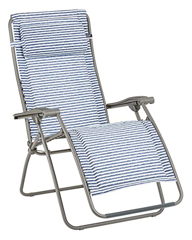 Ein Bestseller unter den Relaxliegen von Lafuma ist das Gestell mit der Texty-Bespannung Velio-Mix für ca. 99 €. Hier abgebildet aber das maritime blau-weiß gestreifte Modell RSX POLYCOTON mit der flauschig gepolsterten Liegefläche für himmlische Entspannung in jeder beliebigen Sitz- oder Liegeposition für ca. 159 €. Für ca. 159 € auch als raumsparend klappbare Dreibeinliege vorrätig.
