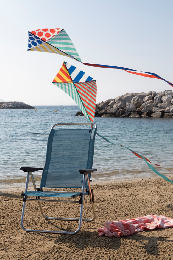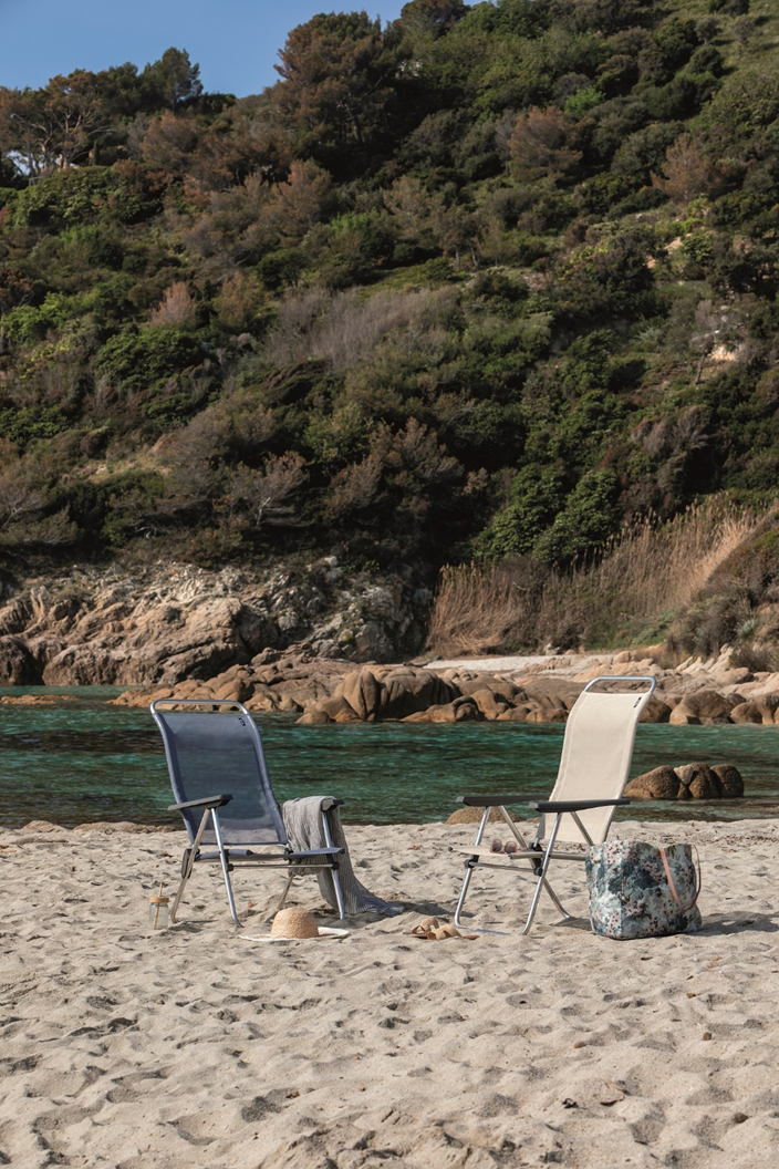 Locker entspannt mit ausgestreckten Beinen das Strandleben genießen. Hierfür ist der federleichte Strandstuhl aus Alu mit wasserfester Texty-Bespannung ideal geschaffen: Mit abgesenktem Sitzteil und hochgezogener Rückenlehne in ergonomischer Formung. Ca. 59 €.
