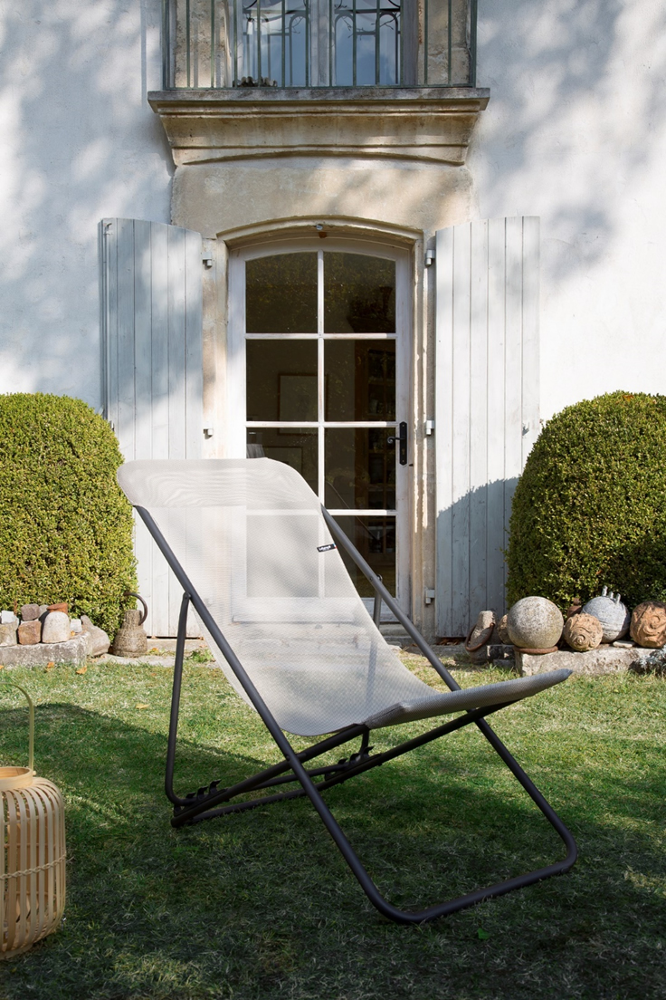 Ein klassischer Liegestuhl aus beschichtetem Rohrgestell mit 4-facher Verstellbarkeit und Texty-Bespannung in graphit oder dunkel obsidian. Als Campingmöbel auf Reisen extrem flach zusammenklappbar für ca. 69 €.