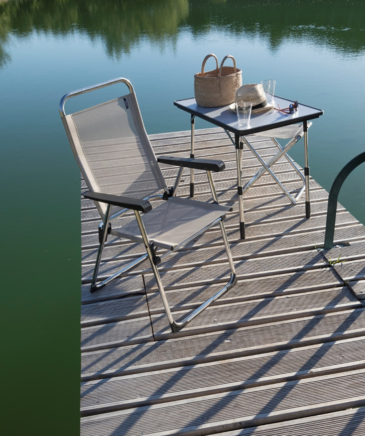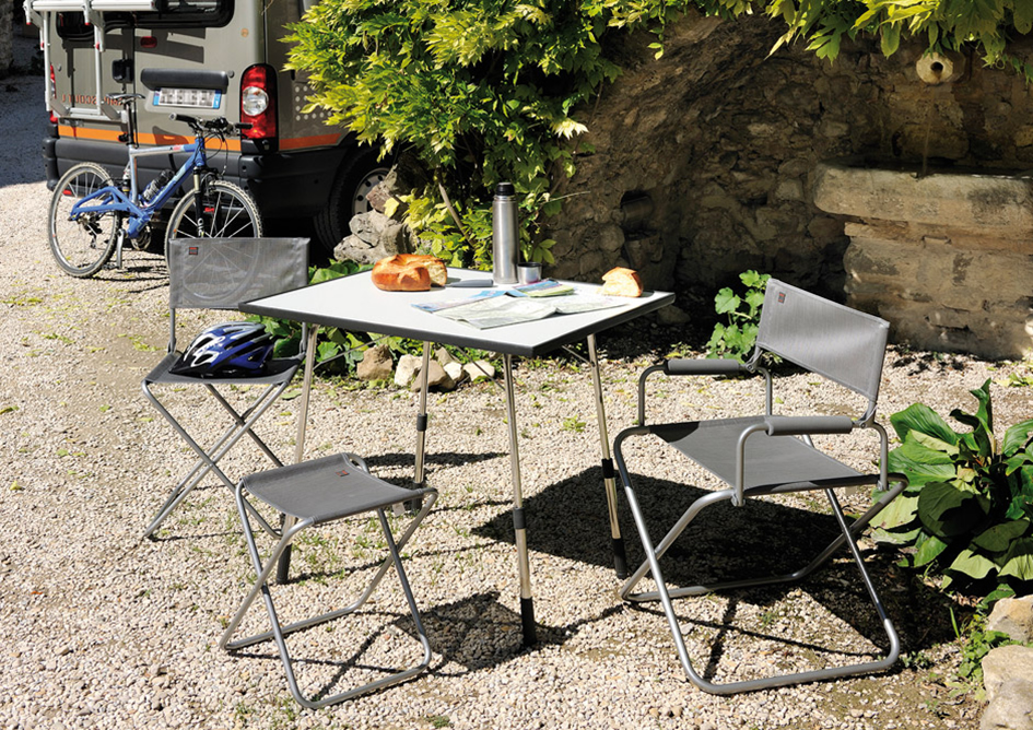 Sehr stabile Campingmöbel in kompakter Form. Der Sessel aus Alu mit Texty-Bespannung und breiten Armlehnen für ca. 69 €. Der höhenverstellbare Klapptisch CALIFORNIA mit Kunststoffplatte 73x60 cm ca. 59 €. Alternativ FIDJI mit U-Bügel-Klappgestell und Platte 80x57 cm ca. 49 €.