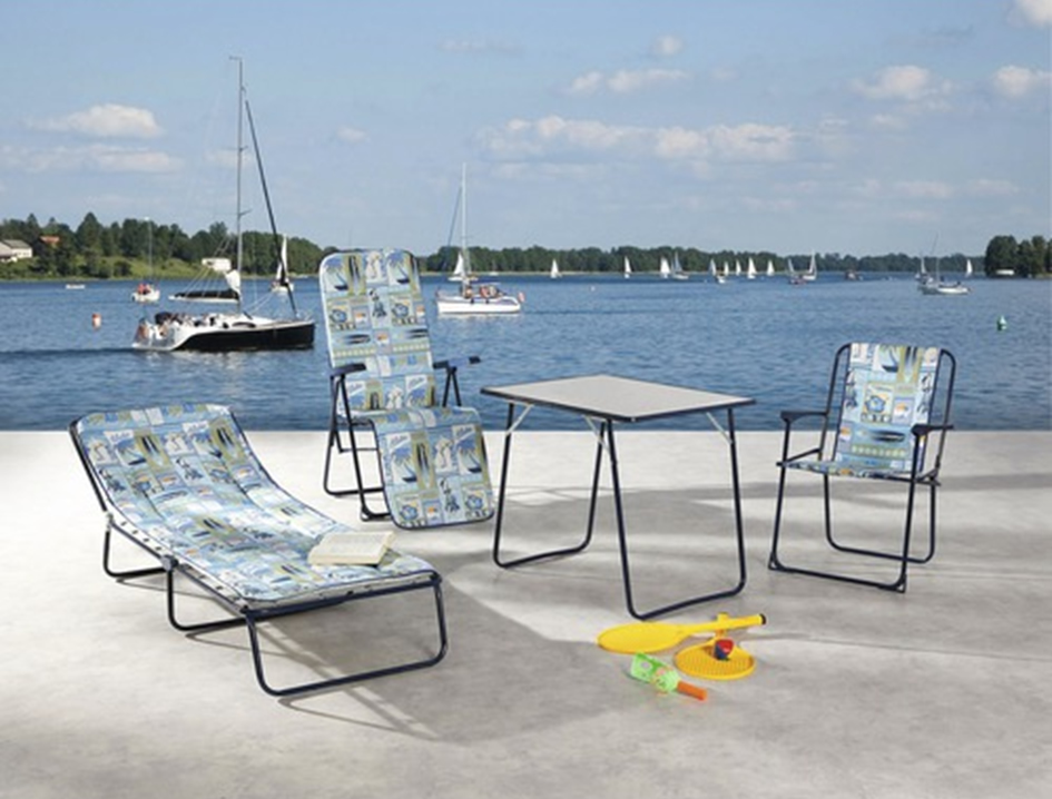 Beschichtete Stahlrohrgestelle mit soliden Metallgelenken klappbar. 2 cm dicke Schaumstoffpolsterung mit Baumwollstoff blau-weiß und Federaufhängung am Rohrrahmen. Die Dreibeinliege 180 x 60 x 24 cm für ca. 59 €, die Relaxliege ca. 59 €, der Klappstuhl ca. 29 € und der Tisch 60 x 80 cm ca. 49 €.