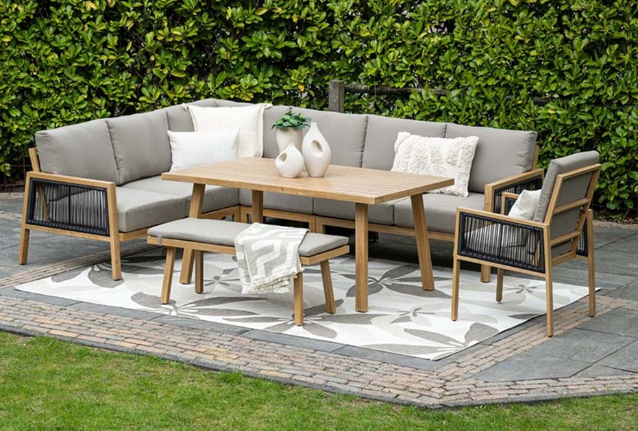 Ecklounge im Aufstellmaß 207 x 267 cm (links oder rechts) mit Tisch 150 x 87 x 68H cm für ca. 1795 €. Alu-Gestelle in heller Teak-Optik mit Rope-Bespannung und 12 cm dicken Sitzpolstern. Sessel mit Auflage ca. 249 €, passende Hockerbank 110 cm für ca. 199 €. Teppich 290 x 200 cm ca. 199 €.