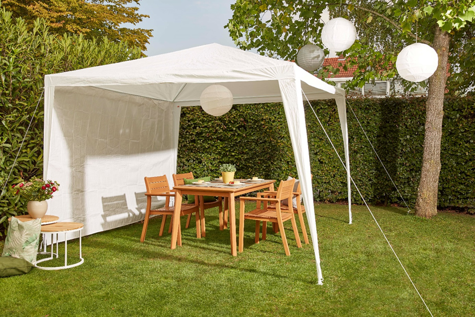 Konstruktion 300 x 300 cm aus weiß beschichtetem Stahlrohr mit Eckverbindern aus Kunststoff. Spitzdach-Höhe 250 cm. Dach mit umlaufendem Volant und Eck-Abspannung aus wasserabweisend imprägniertem PE-Bändchengewebe weiß. Pavillon ca. 39 €. Passende Seitenteile weiß im Set 2 Stück mit Fenster oder ohne Fenster jeweils ca. 18 €.
