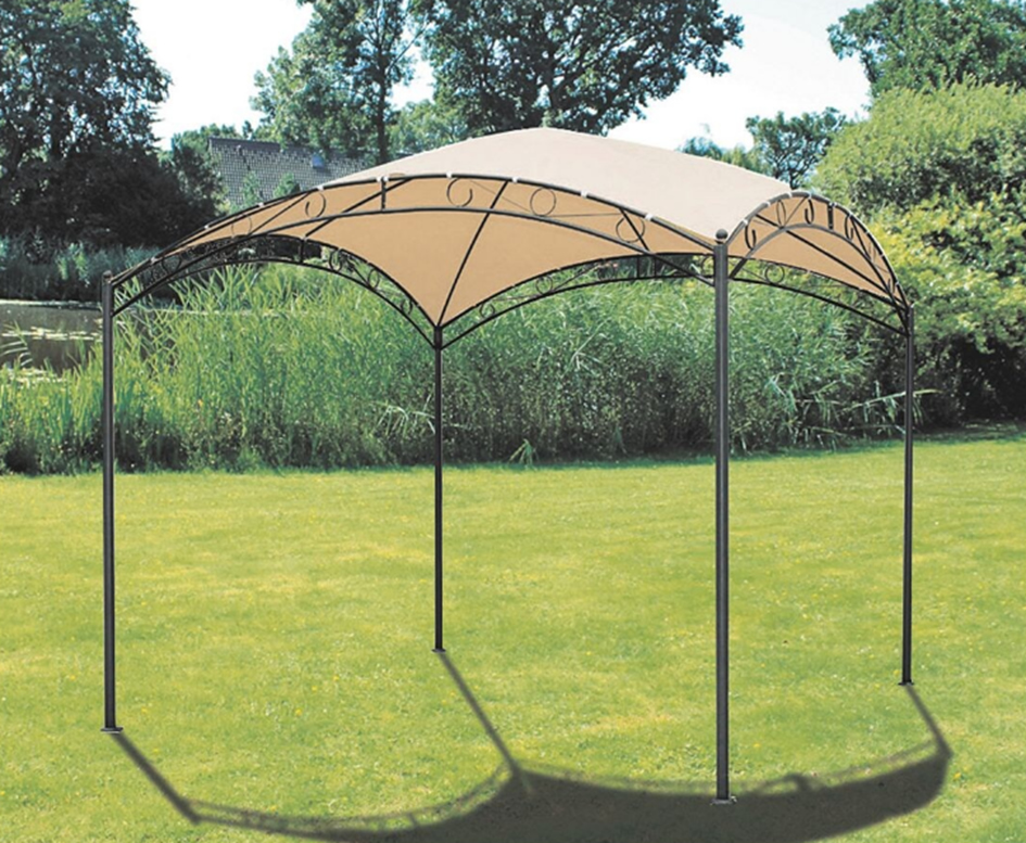 3 x 3 m große kuppelähnliche Dachform mit bogenförmig verziertem Vries an allen 4 Seiten. Stahlgestell anthrazit beschichtet und mit PES-Dachgewebe beige für ca. 249 €. Ersatzdach ca. 79 €.