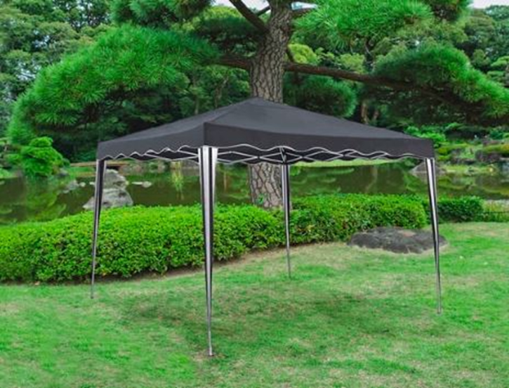 Anthrazit beschichtetes Stahlrohrgestell mit modern überhängender Dachform in der Größe 300 x 300 cm. Das Dachtextil und die 4 Seitenteile aus Polyester taupe. Komplett für ca. 245 €. Ersatzdach für ca. 89 €.