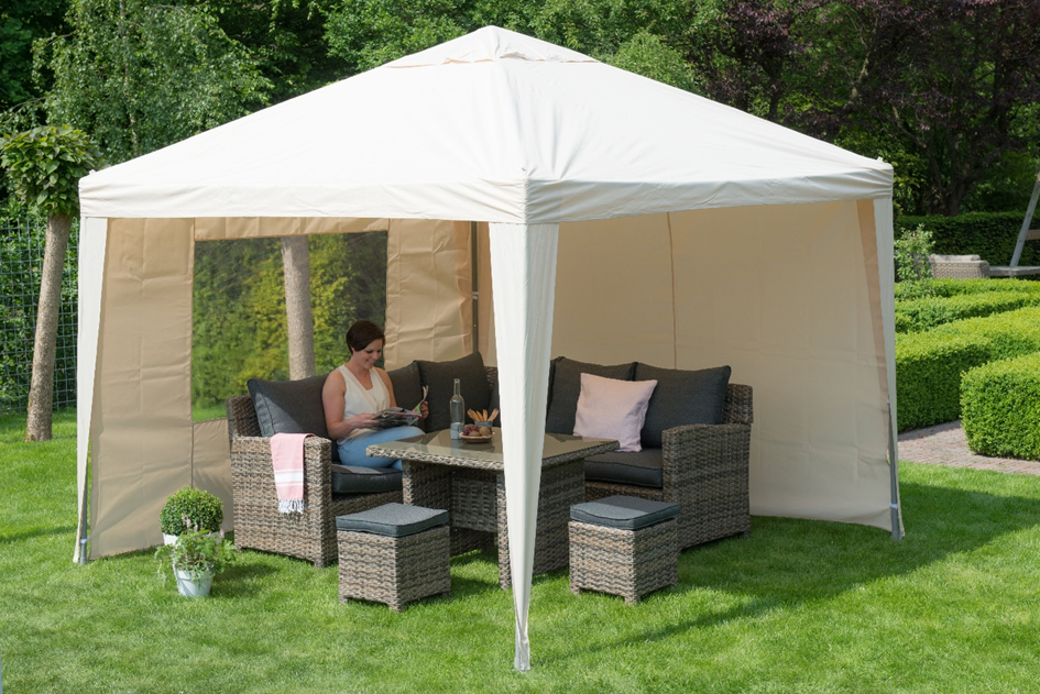 Der Pavillon ist als Schattenspender gedacht. Das verwendete Gewebe ist PU-beschichtet und nur bedingt wasserdicht. Wir empfehlen, die produktionsbedingten Perforationen entlang der Nähte mit einem handelsüblichen Nahtdichter zu bestreichen.