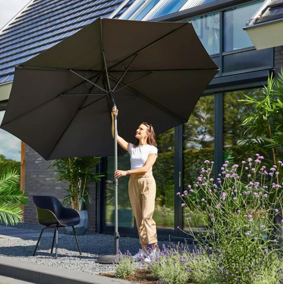 Hochwertiger Sonnenschirm mit „Auto Knick“ und Höhenverstellung. Durch Weiterdrehen der Kurbel neigt sich das Schirmdach stufenlos. Eloxiertes Aluminiumgestell mit Mast Ø 35 mm und Polyester-Bezug in den Farben natur, greige, grau oder anthrazit. In der Größe 200 x 300 cm für ca. 269 €.