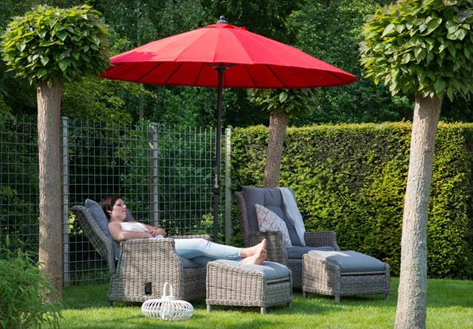 Dekorative Optik durch kleinteilige Schirmsegmente mit 24 Streben. Alu Gestell Ø 250 cm mit Kurbel- und Kippmechanik leicht zu bedienen. Vorrätig in Polyester rot für ca. 129 €.