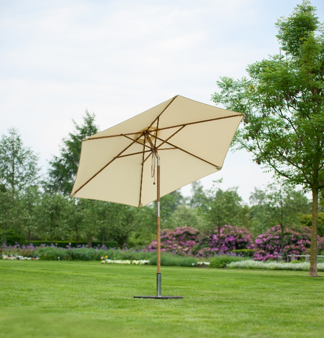 Dieser klassische Holzmastschirm ist ausgestattet mit einem leicht zu bedienenden Seilzug, 6 stabilen Streben, Druckknopf-Knicker zur Neigung des Schirmdaches, abnehmbarer Unterstock Ø 38 mm zur leichten Aufbewahrung, Polyesterbezug. Vorrätig in der Farbe taupe. In Ø 250 cm für ca. 149 €.