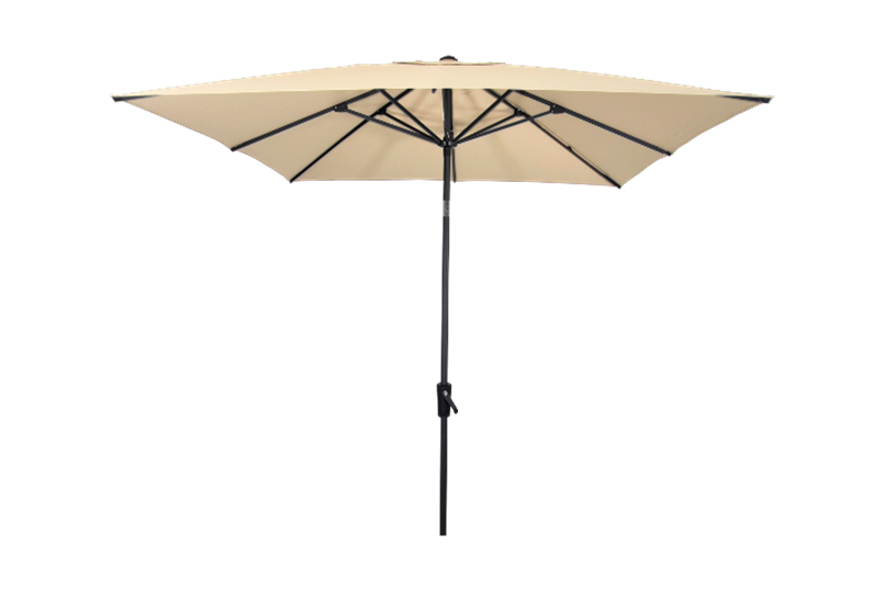 Hier ein quadratischer Sonnenschirm in der Größe 250x250 cm. Seine 8 Streben mit Federsystem verleihen dem Schirm eine sehr gute Stabilität. Sein Kurbelmechanismus ermöglicht ein leichtes Öffnen und Schließen. Zum Neigen des Schirmdaches ist der Schirm mit einem Knicker ausgerüstet. Anthrazit beschichtetes Alugestell Ø 38 mm mit Polyesterbespannung in den Farben natur, grau und taupe für ca. 99 €.